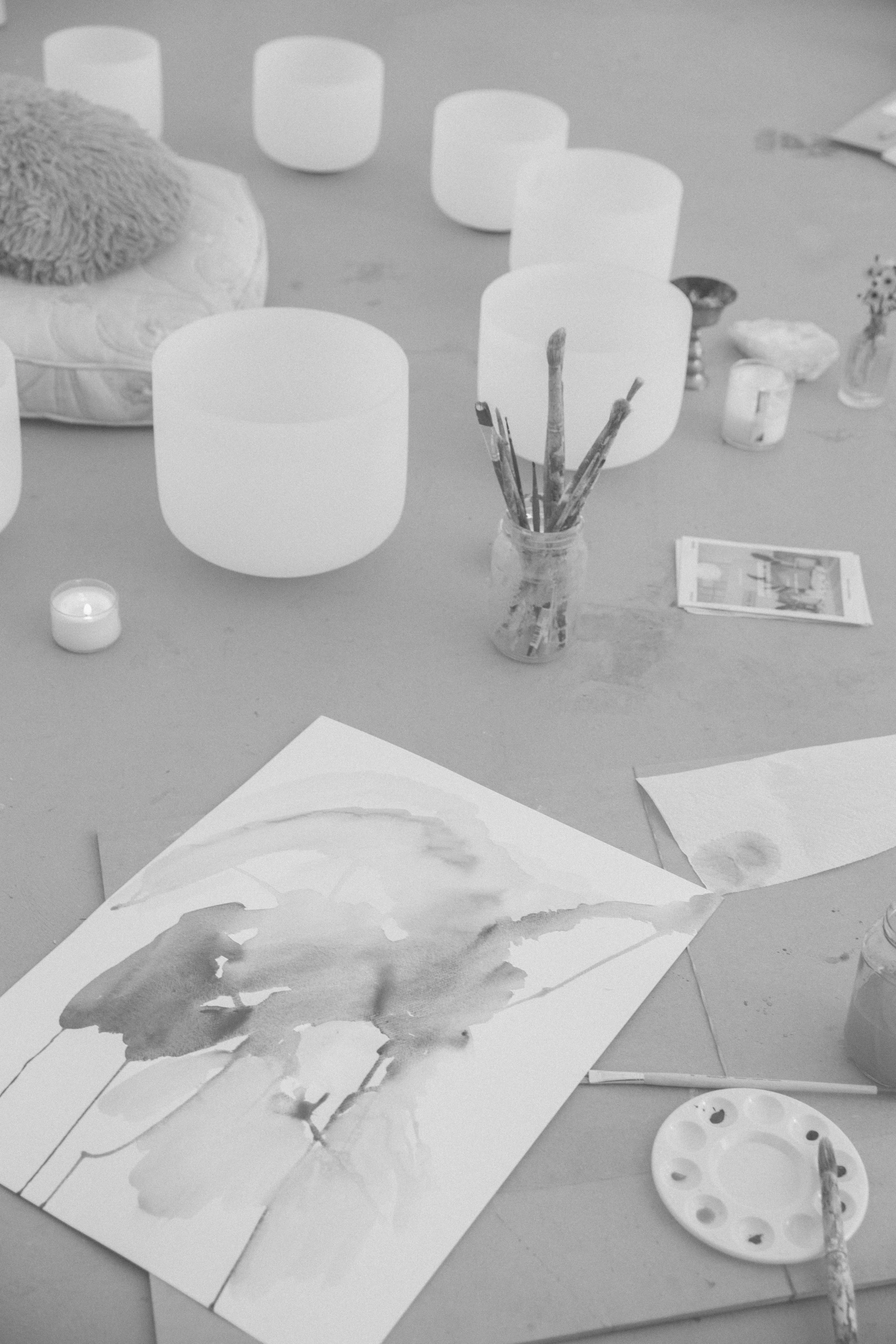Each session begins with a welcome tea or botanical CBD cocktail, allowing the body to settle and arrive. From there, we move into a 45-minute sound bath experience, followed by a creative ritual—either intuitive painting, a gently guided watercolor session, or a more personalized, curated art experience.